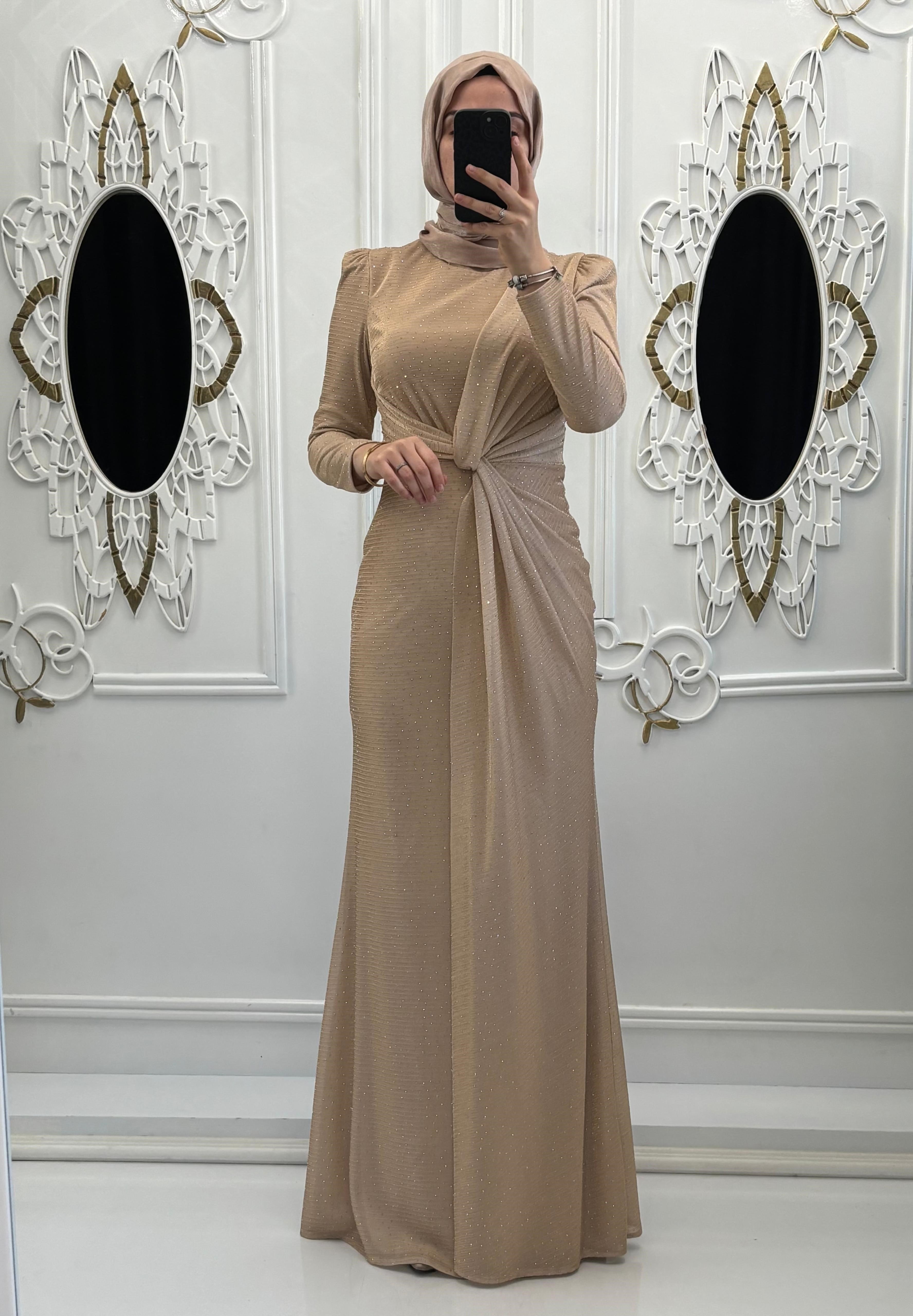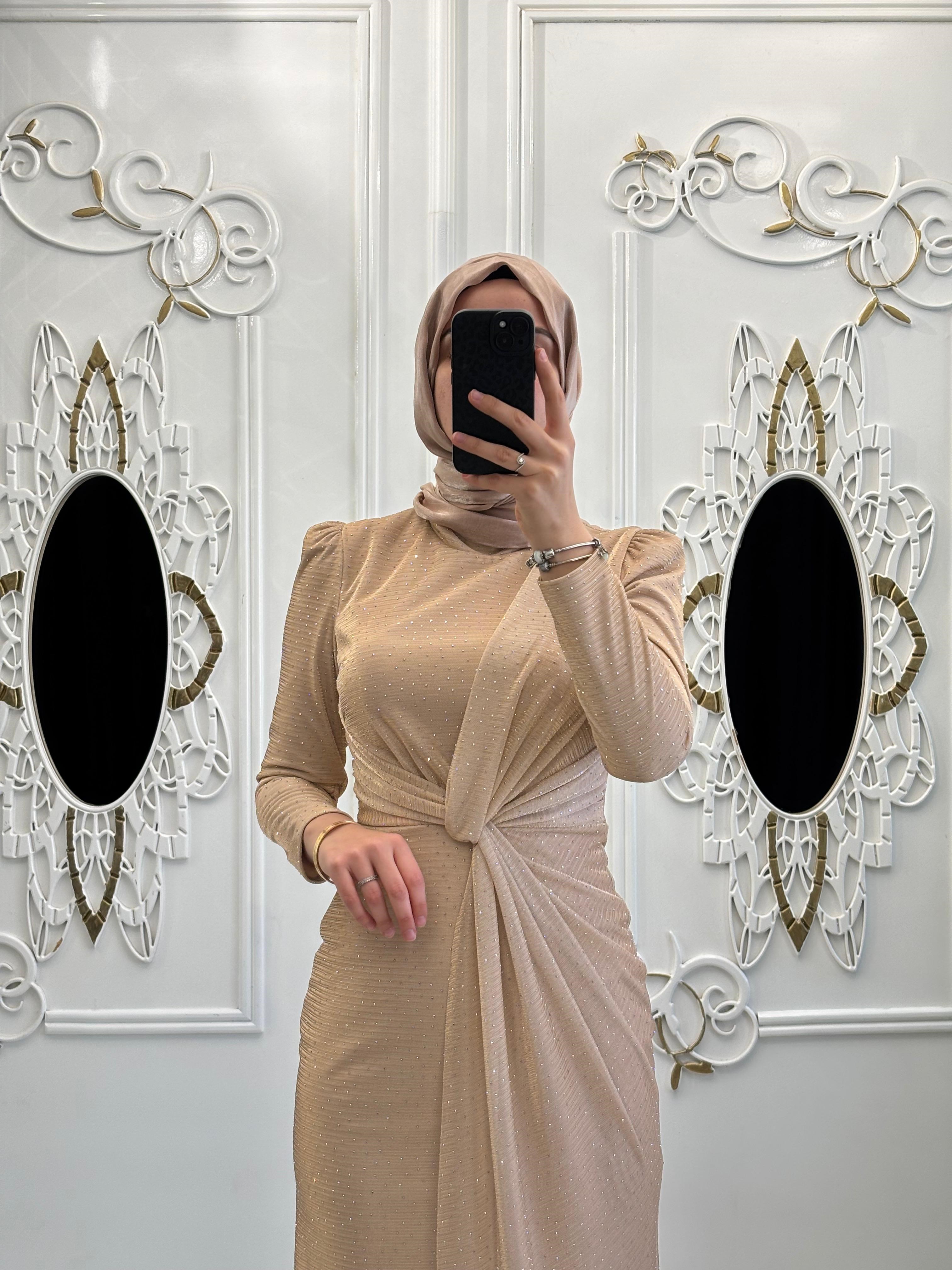 Taş Detaylar: Elbisenin üzerine serpiştirilmiş küçük taşlar, ışık altında ışıltı yaratarak zarafetini artırır.