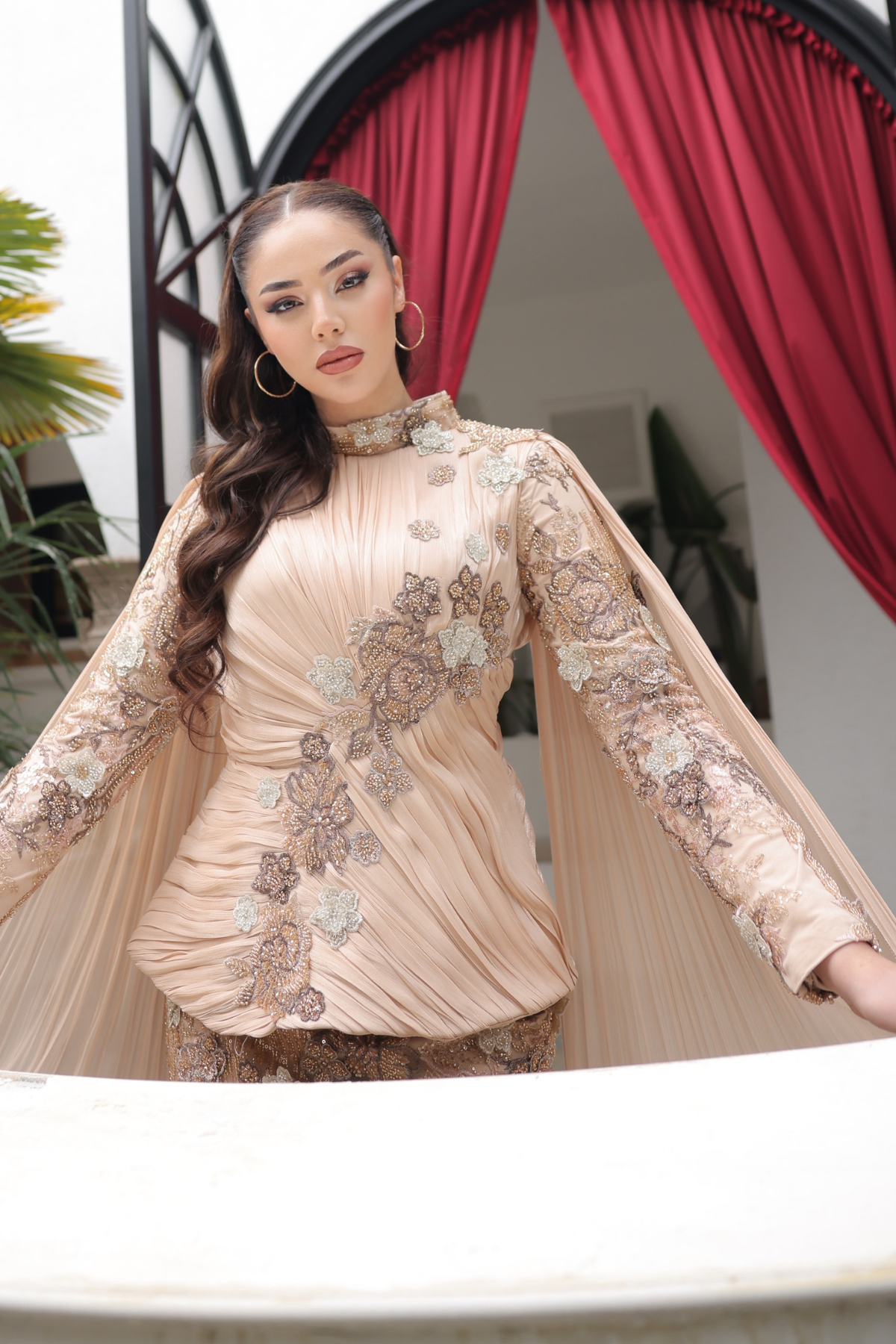 • E-ticaret sitemizde bulunan siyah zemin üzerine gümüş ve pastel tonlu çiçek nakışları ve boncuk işlemeleriyle bezeli elbise, zarif ve şık bir tasarıma sahiptir. Dik yakalı ve belden dökümlü peplum üst detayıyla modern bir görünüm sunarken, omuzlardan yere kadar uzanan şifon pelerin kollarıyla da göz alıcı bir hava katmaktadır. Bu elbise, özel davetlerde, düğünlerde veya özel günlerde şıklığınızı tamamlamak için ideal bir seçenektir. Daha fazla detay ve benzer ürünler için 'tesetturhome.com' adresini ziyaret edebilirsiniz.