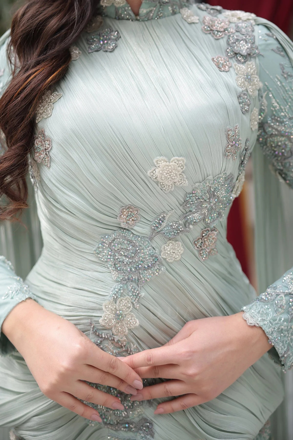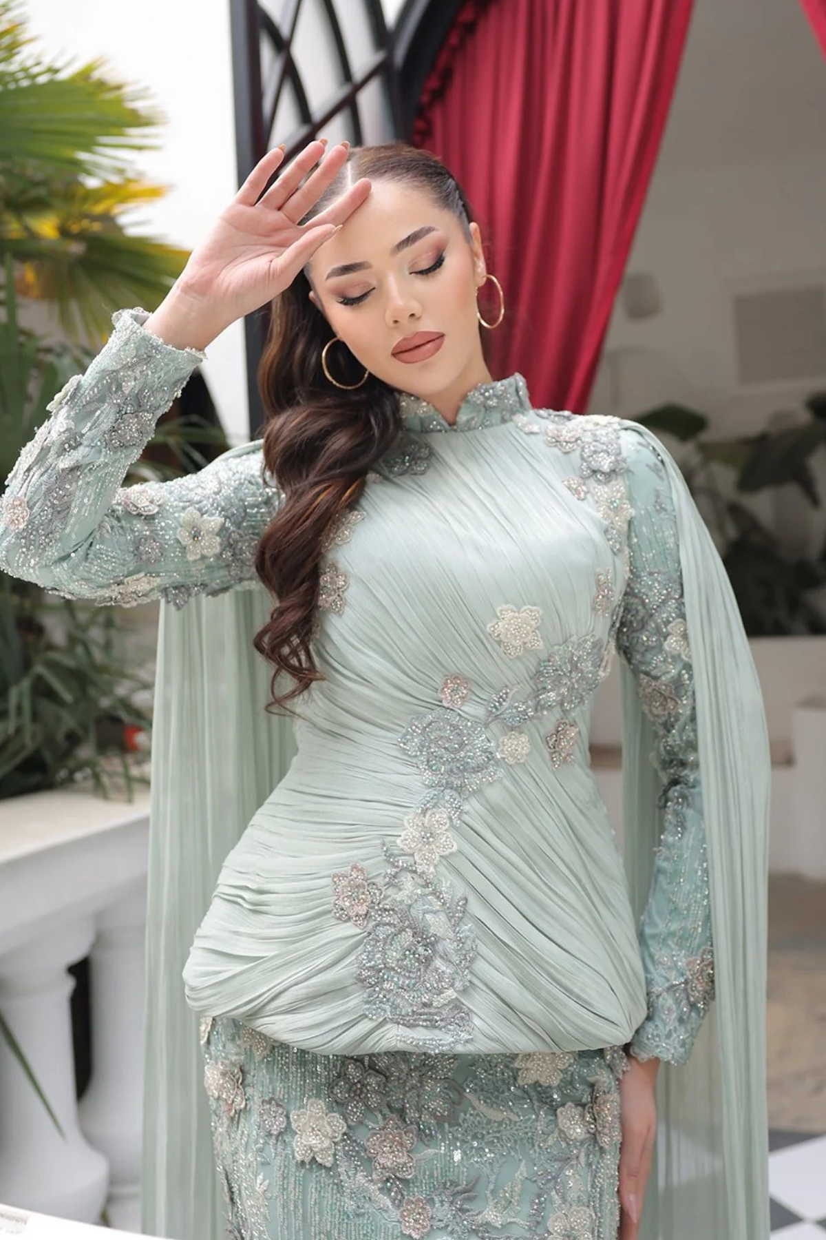• E-ticaret sitemizde bulunan siyah zemin üzerine gümüş ve pastel tonlu çiçek nakışları ve boncuk işlemeleriyle bezeli elbise, zarif ve şık bir tasarıma sahiptir. Dik yakalı ve belden dökümlü peplum üst detayıyla modern bir görünüm sunarken, omuzlardan yere kadar uzanan şifon pelerin kollarıyla da göz alıcı bir hava katmaktadır. Bu elbise, özel davetlerde, düğünlerde veya özel günlerde şıklığınızı tamamlamak için ideal bir seçenektir. Daha fazla detay ve benzer ürünler için 'tesetturhome.com' adresini ziyaret edebilirsiniz.