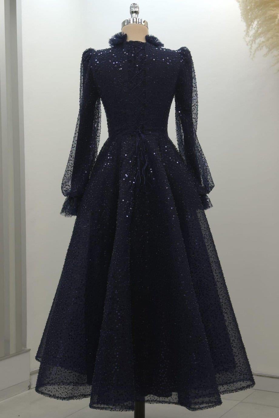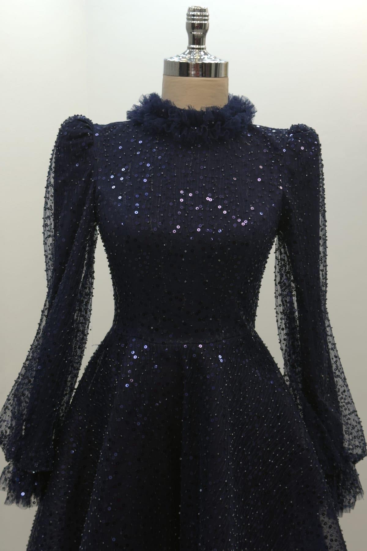 Pullu Kabarık Tesettür Abiye Lacivert